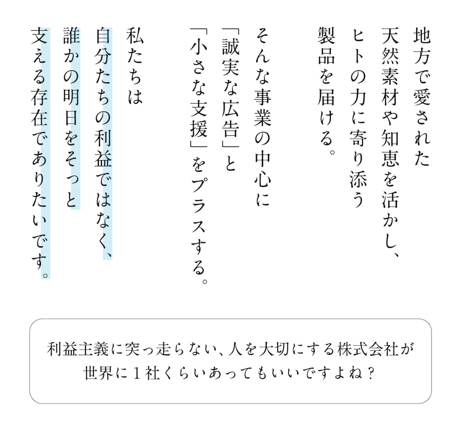 地方で長く親しまれてきた天然素材や伝承の知恵を使い、人が本来持つ免疫力・回復力をやさしく支える誠実な化粧品やサプリを企画・販売しています。