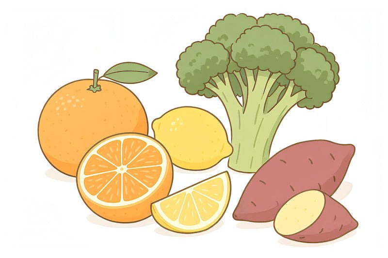 主な食材は、みかん・オレンジ・グレープフルーツなどの柑橘類、キウイ、イチゴ、パプリカ、ブロッコリー、キャベツ、じゃがいも、さつまいもなど。 「毎食どこかに色の濃い野菜か果物をひとつ」と決めておくと、首だけでなく全身の肌コンディションのベースになります。