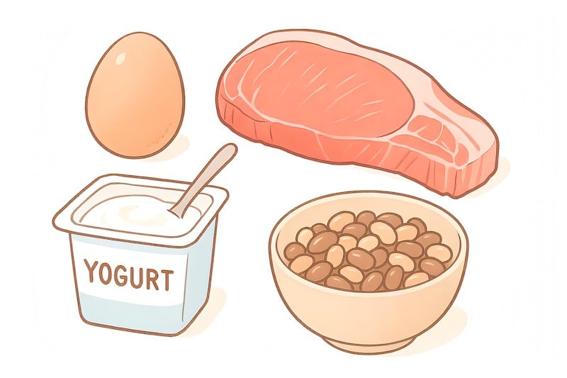 主な食材は、鶏むね・ささみ・豚ヒレ・赤身肉、サバ・鮭・マグロ・イワシ、卵、豆腐や納豆、ヨーグルトなど。 「毎食、手のひら1枚分のタンパク源」という感覚が分かりやすい目安です。