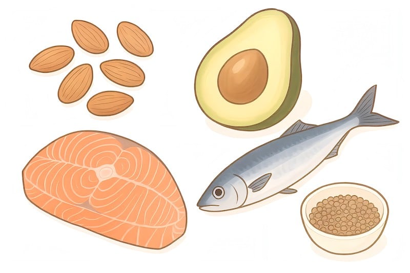 - オメガ3:サバ、イワシ、サンマ、アジ、鮭、マグロ、亜麻仁油、えごま油、くるみ など
