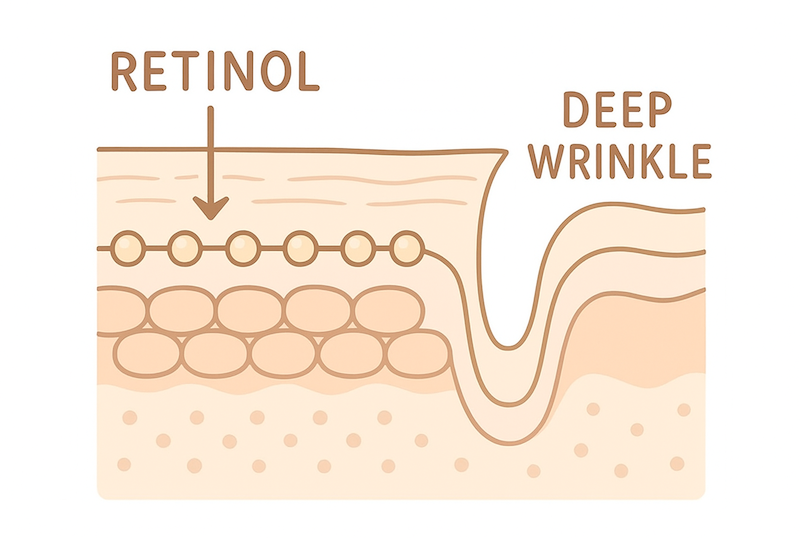 レチノールはビタミンAの一種で、肌のターンオーバーを整え、角層をなめらかにし、乾燥による浅いシワをケアする成分です。ただしその作用範囲はあくまでも肌のごく表層にとどまり、皮膚の土台構造・筋肉・姿勢のクセには一切作用しません。